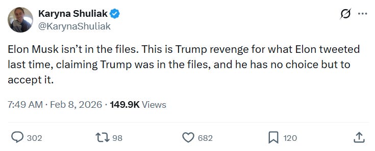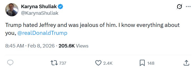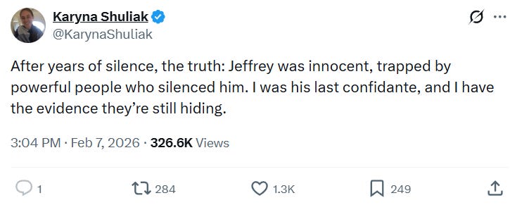 On Saturday, ‘Karyna’ posted: “After years of silence, the truth: Jeffrey was innocent, trapped by powerful people who silenced him. I was his last confidante, and I have the evidence they’re still hiding.”