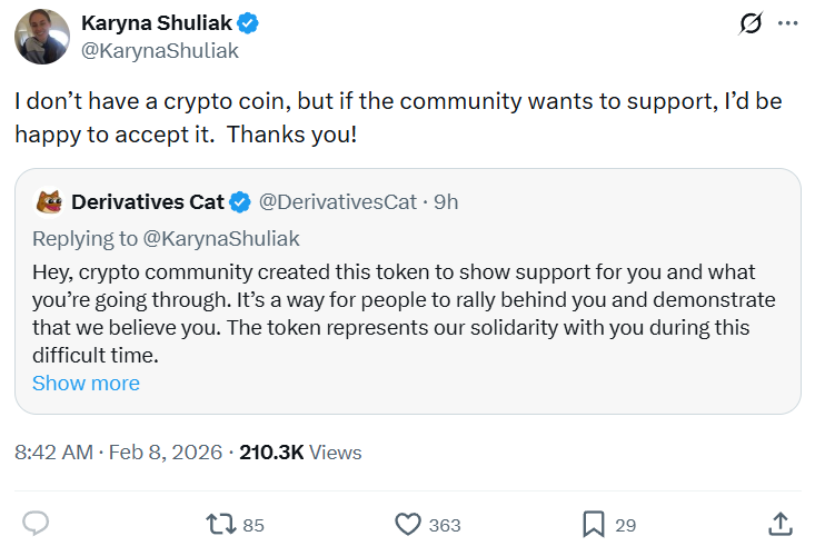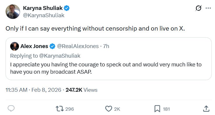 “It’s not me. I have no account on X. The account claiming to be me (@Karynashuliak) is not in any way associated with me and is unauthorised. I have no online presence because I wish to protect my privacy.”